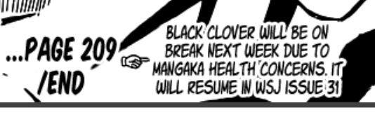 Informed by the scanlations the chapter is delayed due to Author Tabata’s medical issues. “Black Clover Will be break next week due to Mangaka Health concerns. It will resume in WSJ issue 31″, said the scanlations.